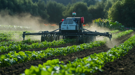 Tractor spraying pesticides on a field with young green lettuce plants.