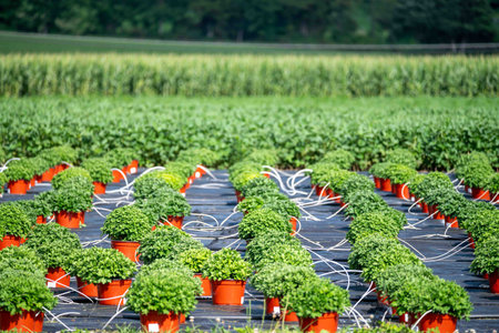Rows of potted mums on a farm with irrigation lines ground cover