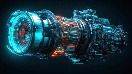 A highly detailed, futuristic engine design with intricate internal components and vibrant lighting effects.