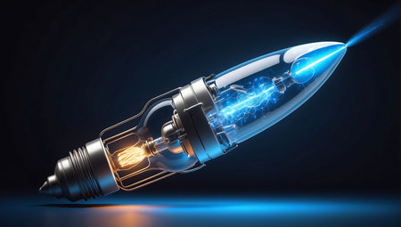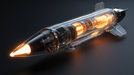 A large, metallic object with a glowing orange tip. The image has a futuristic, industrial feel to it, with the metallic object