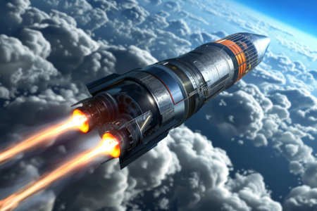 A rocket ascends through space, emitting bright flames from its engines, symbolizing exploration and power.