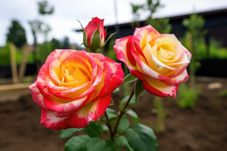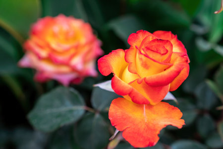 Red and Yellow Rose and Rosebuds in Garden, Close Up, Selective Focus. Rose blooms on a background of green leaves. Summer flower. Natural background.