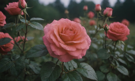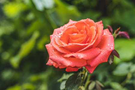 Close up of a wet coral rose with rain droplets on petals, against a soft focus green background, showcasing natural beauty