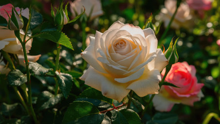 A single cream-colored rose in full bloom is the focal point, bathed in sunlight within a lush green garden.