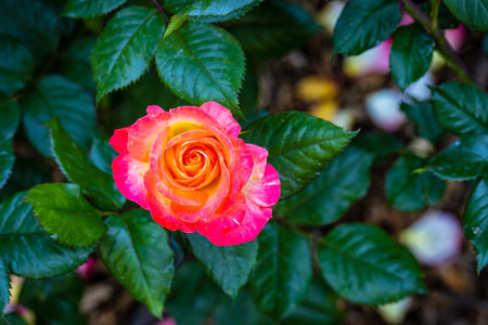 Orange rose bud in full bloom. A single rosebud on a flowering bush in the formal garden. Fragrant aromatic single flower. Gardening, horticulture.