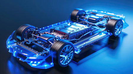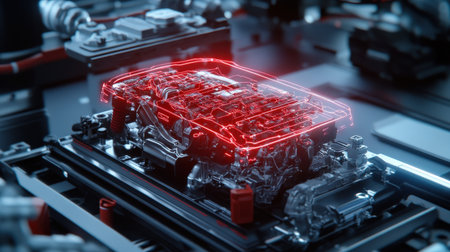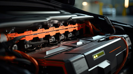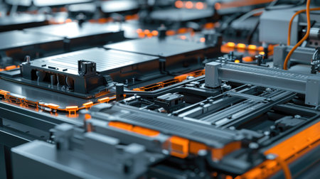 EV Battery Production Factory. Close-up of Lithium-ion High-voltage Battery Components for Electric Vehicle or Hybrid Car. Battery Module for Automotive Industry Production Line.