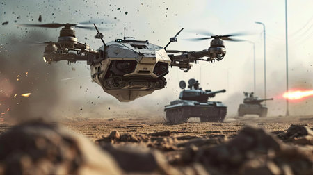 Combat aerial drone attacking a tank