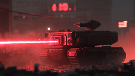 Futuristic tanks advancing in dramatic sunset battle scene.