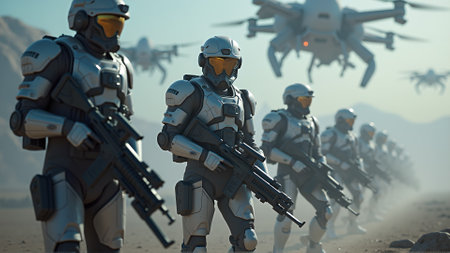 Futuristic soldiers in armored suits march across a desert landscape under drone surveillance, creating a scene of advanced warfare