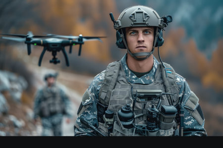A soldier equipped with advanced tactical gear stands ready as a drone hovers nearby amid a dusty landscape, capturing crucial scouting information during a military operation.