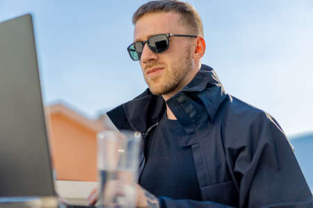 Handsome pensive stylish man sitting on balcony and working on laptop. Home office. Freelance concept. Young entrepreneur.