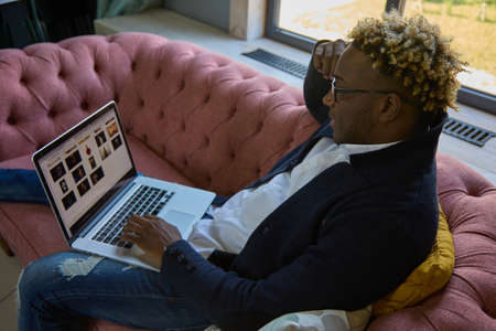Black guy spends time in the networks, a young man lies on a comfortable sofa and uses a laptop, watches movies, works remotely from home