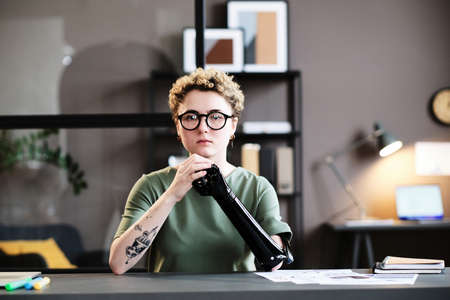 Portrait of young woman in eyeglasses with prosthesis arm looking at camera while sitting at office desk