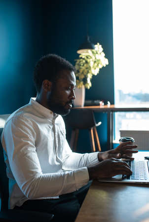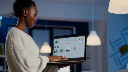 African freelancer typing on laptop late at night standing in start up business office late at night working. Busy employee using modern technology network wireless doing overtime for job searching