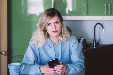 Young business woman in blue sweatshort with cell phone working at home with computer in the kitchen