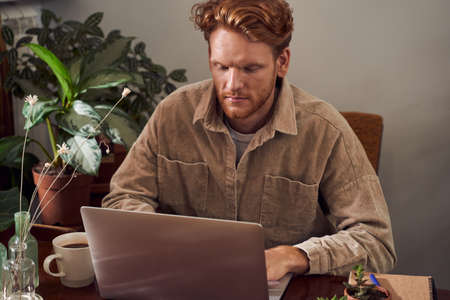Full length shot of serious young male trader drinking coffee while sitting at desk, trading online from home