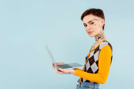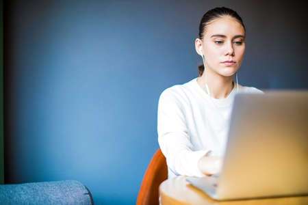 Gorgeous woman freelance content writer keyboarding on laptop computer sitting near copy space background for your promotional content. Hipster girl skilled advertiser working on portable netbook.