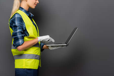 Cropped view of blonde builder in safety vest and gloves pointing at laptop isolated on grey