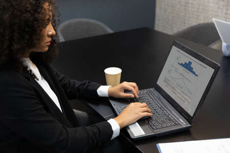 Unrecognized african business woman sitting in a desk and looking at some graphics.