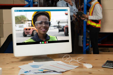 Warehouse staff talking on video call at computer screen in storage warehouse . Online software technology connects people working in logistic factory by virtual conference call on internet network .