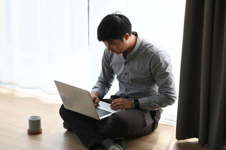 Portrait of young businessman working on laptop while drinking coffee and sitting on wooden floor.