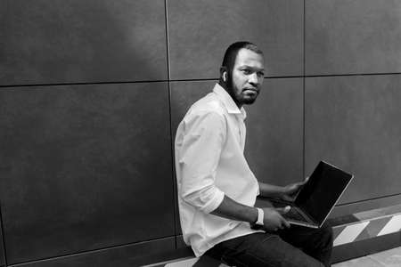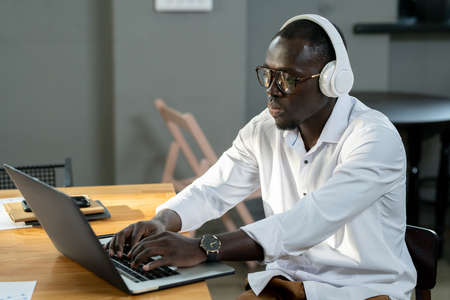 Young businessman of African ethnicity in white shirt and headphones using laptop