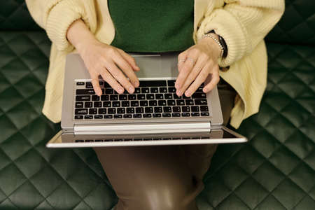 Above angle of hands of young businesswoman or female student over laptop keyboard pressing keys while networking in office