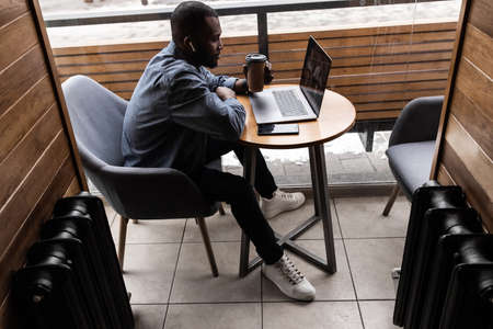 A young businessman leads a virtual meeting online. Nearby there is a glass of invigorating coffee; after the conference, the business man will take a break and rest from his hard working day..