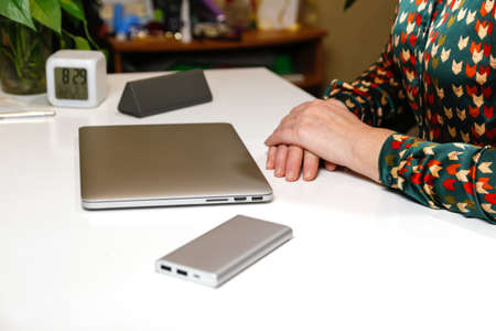 Cropped shot of female freelancer typing on mock-up laptop while sitting at simple workplace