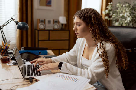 Student stuck at home because of Covid-19. Girl studying or learning from home with laptop.