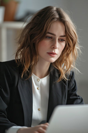 concerned secretary, dressed in a white sweater and T-shirt, works from home, responds to e-mails, solves company problems