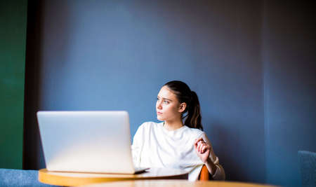Thoughtful business woman thinking about new financial ideas, sitting with laptop computer in coffee shop. Pensive female professional writer dreaming about something during work on portable netbook