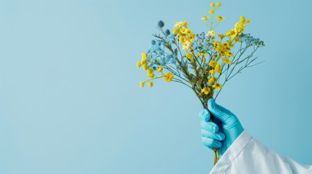 Hand in blue glove holding bouquet of yellow and blue flowers on light blue background. Medical and healthcare concept.