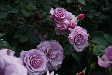 Bush with pink rose flowers on a background of emerald foliage, flowering,