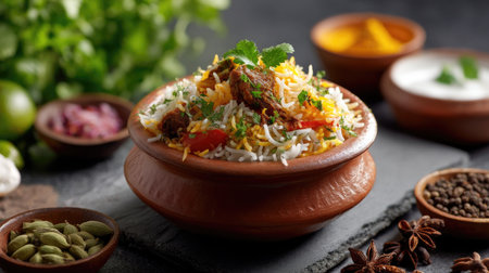 This vibrant biryani dish showcases aromatic rice layered with tender meat and fresh herbs in a traditional clay pot, perfect for food lovers.