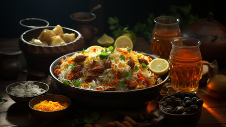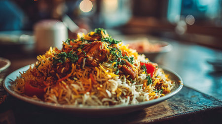 Delicious Chicken Biryani Dish Served on Rustic Wooden Table Surface