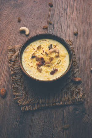kheer or rice pudding is an Indian dessert in a brown terracotta bowl with dry fruits toppings