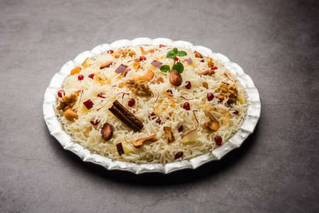 Kashmiri pulao made of Basmati rice cooked with spices and flavored with Saffron and dry fruits