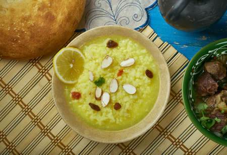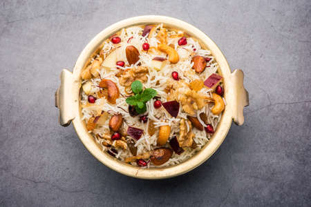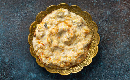 Pakistani cuisine , Palatable Kheer, condensed milk sugar and rice, Indian version of rice pudding . Traditional assorted dishes, Top view.