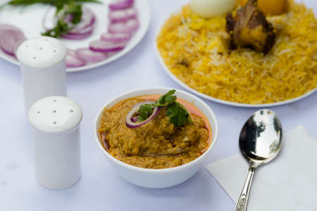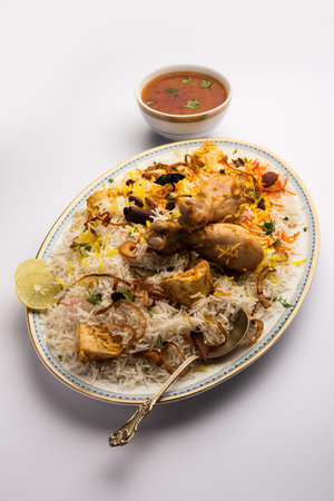 Traditional Hyderabadi Chicken dum Biryani made of Basmati rice cooked with masala spices, served with Salan, selective focus