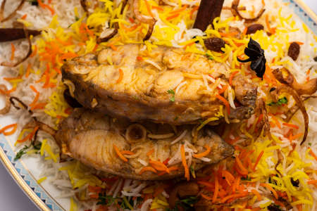 Savor the Exquisite Fusion: A Closeup of Delectable Fish Biryani, Infused with Aromatic Basmati Rice and Coastal Flavors