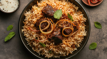 A delicious top view of spicy mutton biryani, with succulent pieces of mutton over long-grain basmati rice, garnished with fried onions and mint leaves,