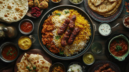 A dynamic top view of an Indian Iftar table with spicy biryani, seekh kebabs, dal, chicken curry, naan, and samosas, highlighting the richness of Desi cuisine.