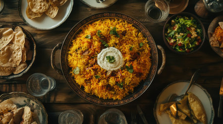 A vibrant platter of aromatic biryani served with yogurt and crispy sides. Perfectly garnished, this dish showcases the essence of traditional Indian cuisine.
