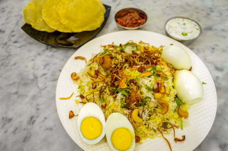 Chicken Biryani with eggs, papads, pickle and raita on a white marble floor - Top View