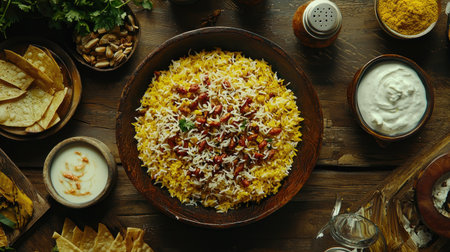 A vibrant and colorful rice dish sits at the center of a rustic wooden table, surrounded by fresh vegetables and savory accompaniments, inviting all to enjoy.
