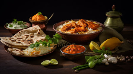 A North Indian dinner with butter chicken, naan, and biryani in a still life setting