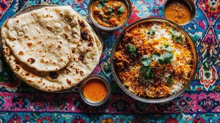 Top view of a traditional Indian meal with biryani, curry, and naan bread on a vibrant tablecloth