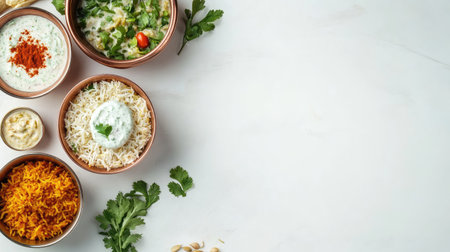 Top view of biryani served in a copper bowl with raita, clean white background, no people, copy space