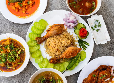 steam chicken biryani pulao rice, makhni chicken boneless handi, haleem, chicken karahi, korma, nihari, tandoori, salad and raita served isolated on background top view of indian and pakistani food